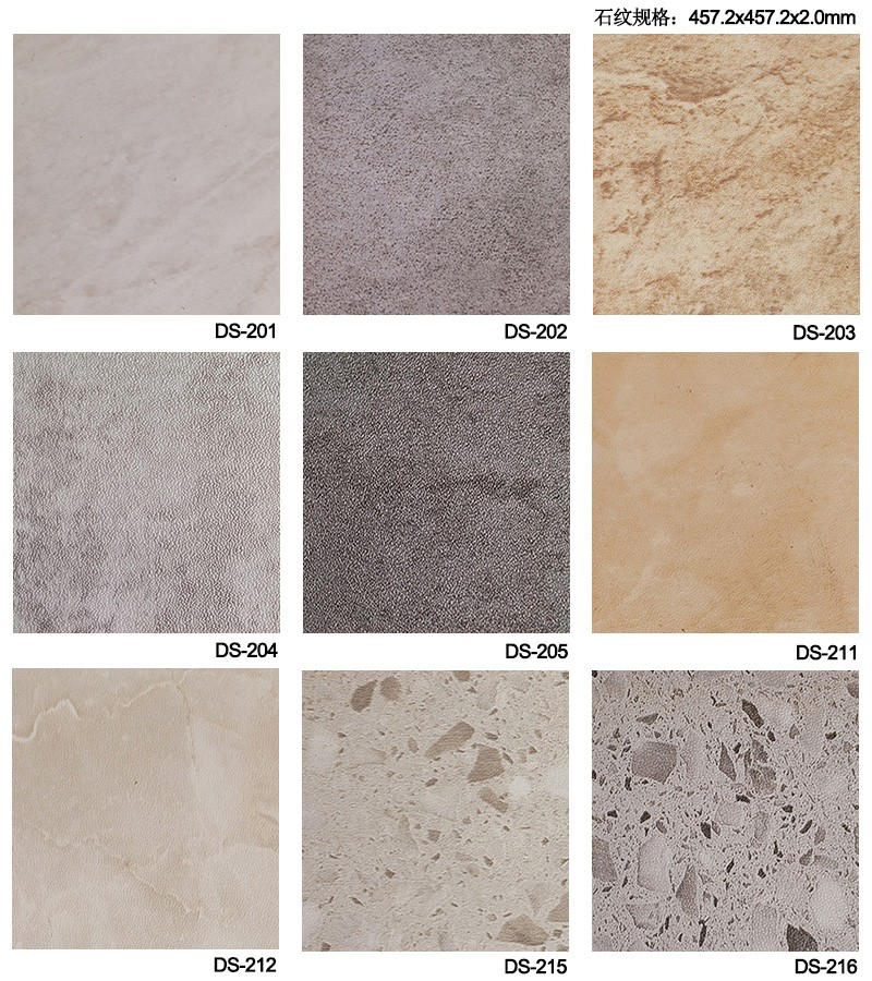 片材PVC地板規格(Dimension):457.2x457.2mm(地毯紋和石紋) 915.8x153.5mm(木紋)